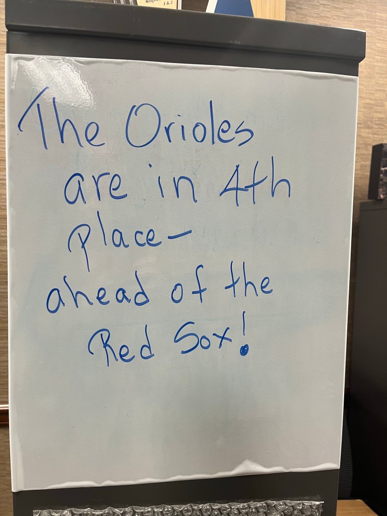 The Orioles – Birdland is humming with excitement about the Baltimore Orioles improved performance this year. My coworker wrote this little note outside her desk today about the Orioles’s 4th place spot in the AL East. The O’s hold a special place in my heart. Speaking of heart, my heart is a little heartbroken at the same time because the Oriole’s traded Trey Mancini today.