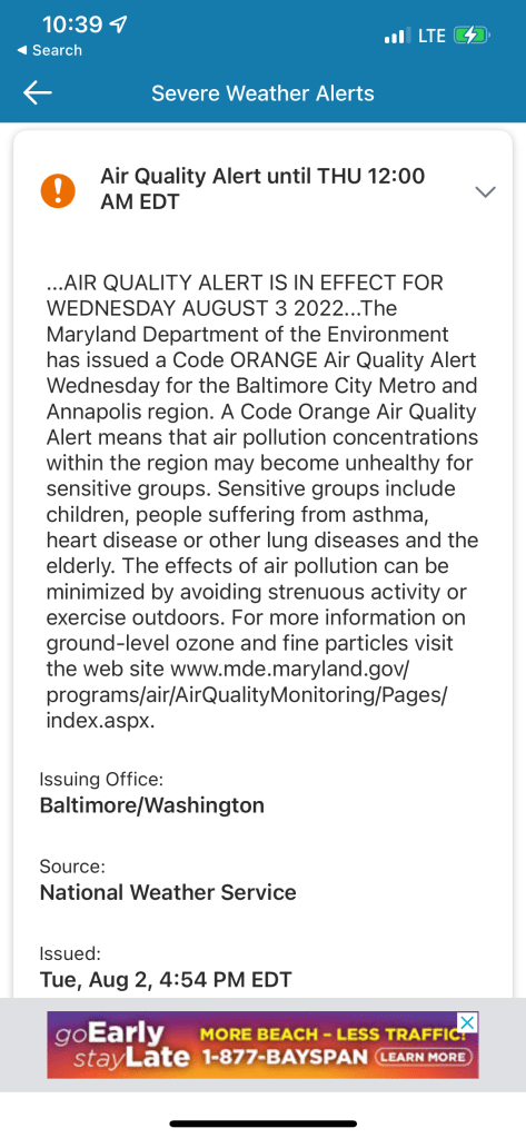 Air Quality – Today is a Code Orange Day and it’s got me down. I’m not sure why, since I don’t have an underlying health issue, but these days with poor air quality really effect me. My throat is sore and scratchy and my eyes water. I think it has to do with the poor air quality and particulate matter in the air mixing with pollen. It becomes like a toxic soup for me.