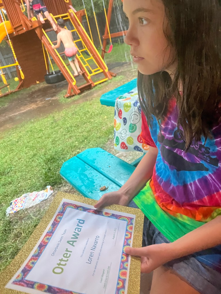 Swim Team – Tonight was the summer swim team end of season banquet at our pool, the Otterbein Swim Club. It was a night to remember for two reasons. First, it stormed like crazy and the whole team huddled under a little pavilion which was about ankle deep in water at one point. 2nd, Loren won a team spirit award! We were both happy about it. She got a later start in swim team than most because I was too disorganized when she was younger. I know it’s hard for her to not be a super strong swimmer compared to some of the other kids but she has taken a real interest in it and tries hard. We all ended up laughing and having fun on a very rainy and somewhat scary evening at the pool.