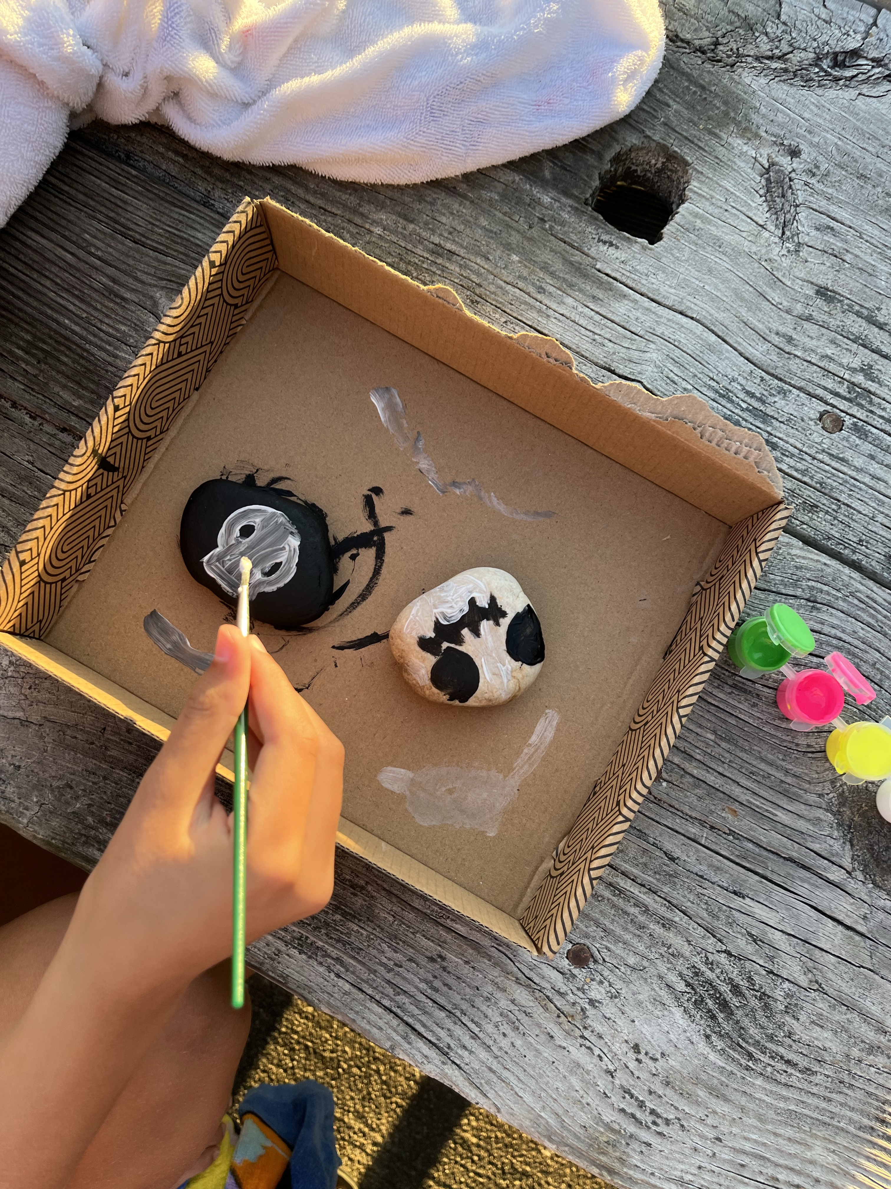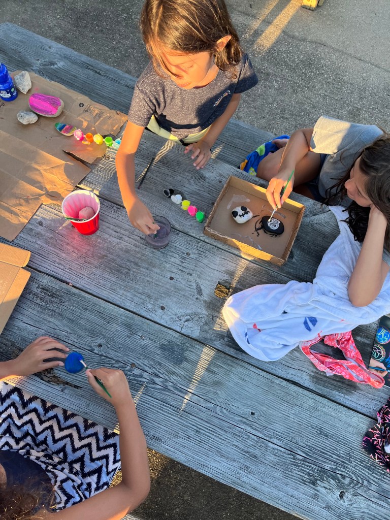 Rock painting – It was the first quiet night of our vacation so we busted out the rock painting kit Kendall got for her birthday. We soaked in the evening air and tranquil blobbed while getting creative. We will add our new creations to our garden at the beach.