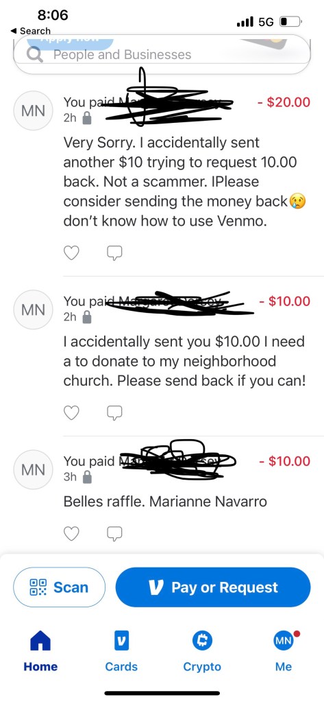 A fool and his money are soon parted. I’ve been burned twice now by Venmo. I definitely am at fault in both cases but it still irks me how easy it was for me to be out of pocket. The first time, I was swindled by a hacker of some sort. It happened one day over the summer when I noticed that I received about five emails from Venmo that someone tried and failed to login to my account. It did concern me but I was busy at work and didn’t have time to think too much about it. A little later that day, I got a call from a strange number on my phone and when I picked up, they said it was Venmo. I would not normally answer the phone for a number I did not recognize but my kids were in summer day camp that week and I wanted to be sure it was not one of the counselors calling from their cell phone. The person on the line was a man with a foreign accent. He explained that Venmo noticed some unusual activity in my account and asked me to confirm some info on my account. He listed some recent transactions, which I confirmed, and as soon as I did that I felt something was wrong. I hung up the line immediately. Sure enough, I instantly had two transactions, one for $80 and one for $44, show up and deduct from my account. The caller tried to call me back 10 times over the next 3 minutes until I blocked the caller and the screen name on Venmo. Boy did I feel dumb! These hackers are so realistic! I’ve been feeling so stupid about that situation and then today I did something even more dumb!! I was at our annual neighborhood festival in the park and was asked to donate to the local women’s at the Catholic Church for a chance to win a $1,000 raffle. I decided to buy 3 tickets for $10. I was out of cash because my kids had used it all for games and candy so I Venmoed the woman using the account she listed. Or at least I thought I did until she told me that she did not receive the alert. When I looked more closely, I realized that I forgot to add a number to the account and paid the wrong person. I was already feeling frazzled from chasing three kids around the park and so I made a mistake. My husband suggested I request the $10 back in the app from the stranger. I thought that was a great idea! Until I accidentally paid her $10 again instead of requesting the $10. I tried to explain the situation in the little message box, but I feel like I sounded like an internet stalker/hacker than a tired mom. This time, I wrote the note and tried to send a request for $20 to get all my money back and somehow I paid her AGAIN instead of requesting the money. How foolish can you get? I clearly was not paying attention to what I was doing. In the end, I sent a final request to the stranger for the $40 I erroneously sent with a sad emoji. It has been a few hours and I have not received any notifications in the app and don’t feel optimistic I will ever see that money again. I probably wouldn’t send it back either because I would think it was a hoax. I didn’t win the raffle either. Let this be a lesson to others to pay attention to what you are doing when you are using Venmo. Otherwise you can be out real money like what just happened to me!!